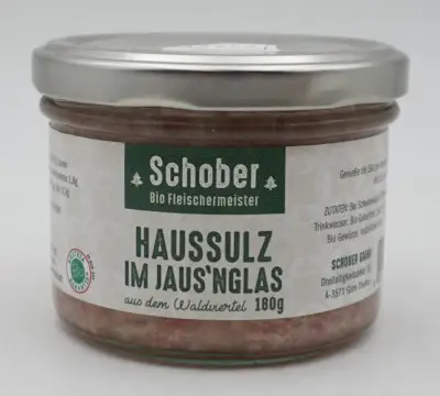 Alle Produkte von Schober - Waldviertler Bio Wurstmanufaktur zur Homepage| Zutaten | Schweinefleich u. Schwarten (60%), Trinkwasser, Salz (50% Pökelsalz u 50% Quellsalz), Gelatine, Zwiebel, Gewürze, Essig (10%), Rohrohrzucker |